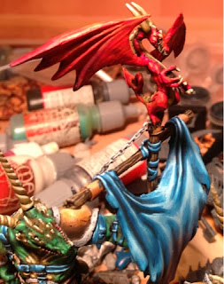 As always, I tend to start on the lowest layer of the model when painting. Hence, we start with skin, then we'll do the wraps and cloth over the skin, then the claws and horns on top of the skin, then the metal armor on top of everything else. This unit was painted over three weeks, so any jumps in layering, note-taking, or bits where I just sort of did all the non-metallic-metals without talking about it are to be taken in stride.
